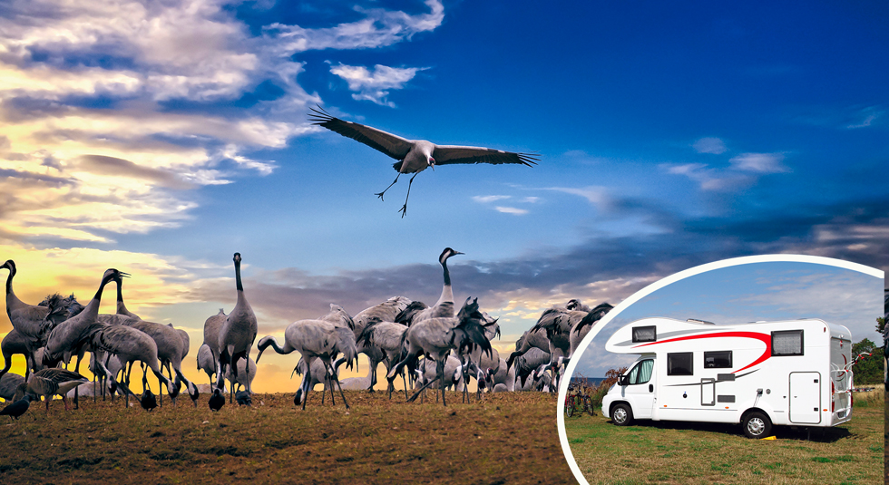 Tranorna är här! Vill du se resten av himlens husbilister återvända? Här är guidningar och övernattningar för dig som vill se tranorna dansa.