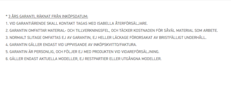 Isabella ger dig en ökad köptrygghet med en garanti som gäller i tre år. Denna frivilliga garanti går långt utöver vad lagen ger stöd för och ökar din trygghet i köpet. Garantin kan gälla problem med sömmar, dragkedjor och liknande. Fel som beror på handhavandefel eller bristande underhåll är undantagna.