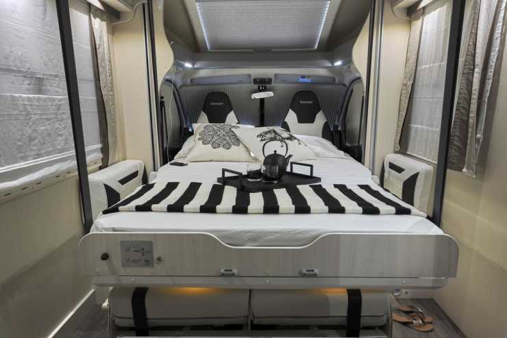 Att montera den nedsänkbara taksängen i längsled kan bli en ny trend. Förutom tyska Bürstner och Dethleffs, vilka vi nämnt tidigare, kommer även franska Chausson och Challenger med denna platsbesparande bädd till 2016.