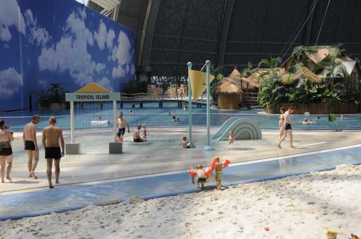 Tropical Islands ligger i världens största byggnad, åtminstone världens största utan stöttande takpelare. Det är en rätt speciell upplevelse att vistas under ett tak som är 107 meter högre upp. De fem takbågarna som utgör byggnadens ram är fästade i 40 000 kubikmeter betong för att stå stadigt. Mellan varje båge är taket transparent och släpper igenom 80 procent solljus, till glädje för besökare som vill bli bruna.