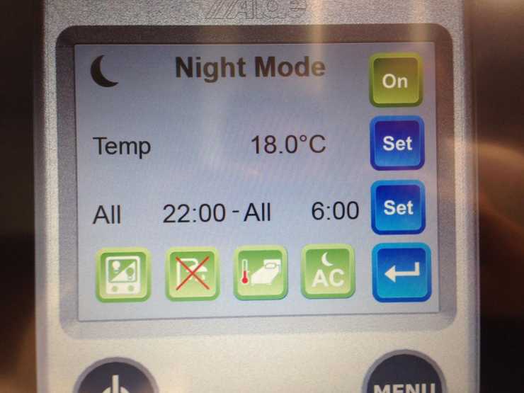 Ytterligare finesser är att ljuset på panelen kan inverteras så att den inte blir alltför lysande på natten, du kan ändra temperaturgivare från soffgruppen till sovdelen för att optimera temperaturen just där du befinner dig, välja natttemperatur och stänga av varmvattnet på klockslag du själv bestämmer. Självklart minskas automatiskt fläkthastigheten på natten så att du inte störs av din ac-fläkt.