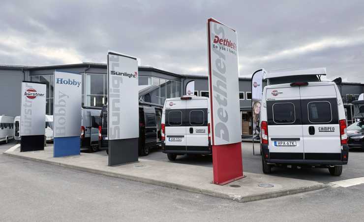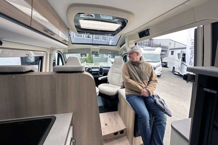 – Något som är lite kul är Alpan med husvagnssoffan därbak. Den märker vi har blivit mer populär. Annars har vi Dethleffs XL I7850. Folk som haft den byter ofta till en likadan för den är så bra. De vill bara ha en ny, uppdaterad. Den säljer mycket på sitt kök, det är fantastiskt och utvecklat av kvinnor.