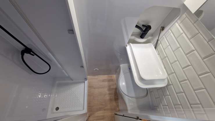 Det mest unika med Freedom är förstås att man valt att ha kvar lastväggen. Det ger både fördelar och nackdelar. Fördelar är att man får en till vägg att möblera emot. I freedoms fall har både kök och badrum placerats mot lastväggen.