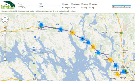 Skriv in var du reser ifrån och vart du ska så ser du vägsträckan på en googlekarta med tydliga markeringar över antalet viltolyckor och var de har skett. Det går även att sortera på olika viltslag och se var det till exempel har skett flest vildsvinsolyckor.