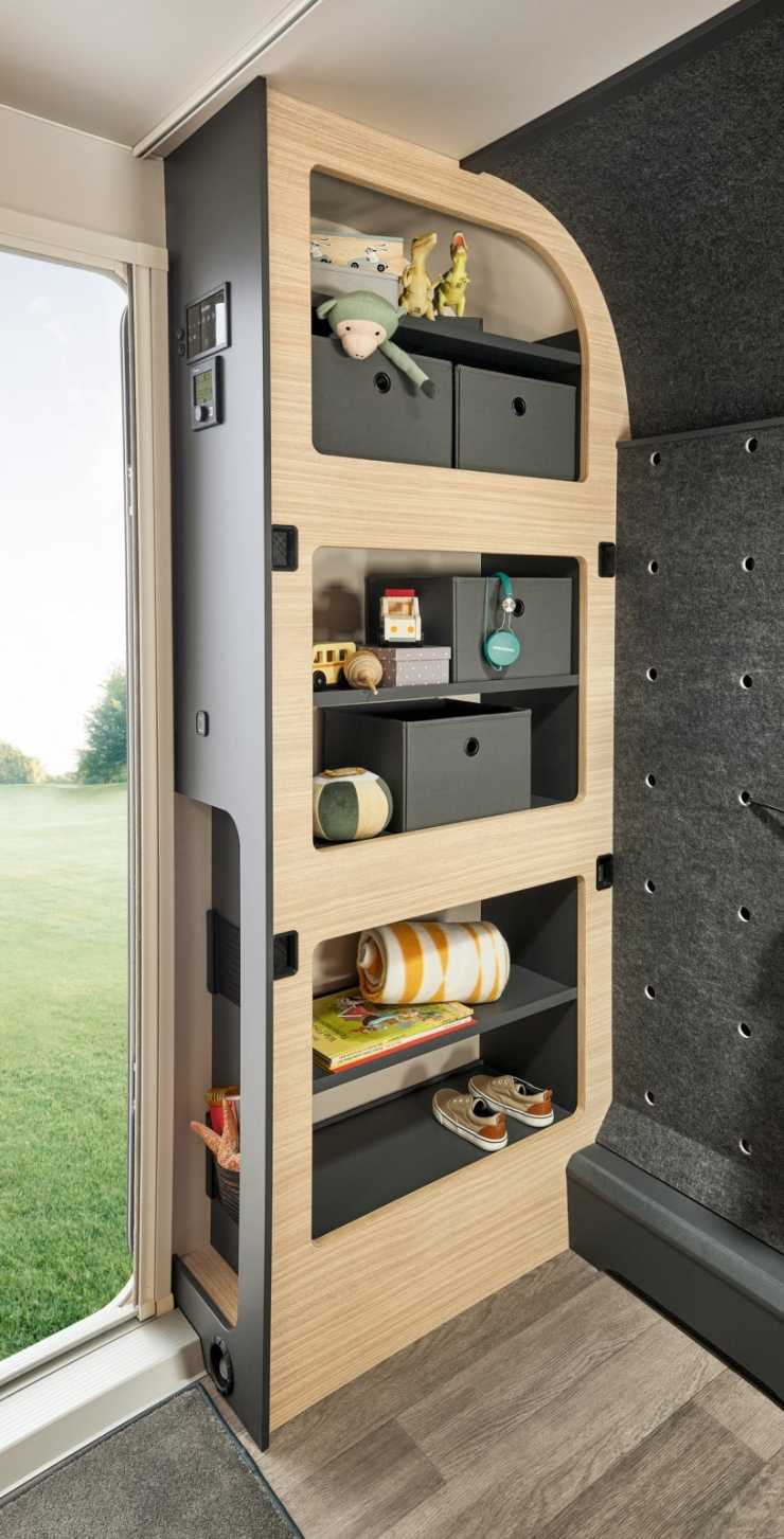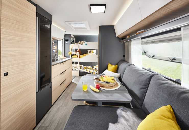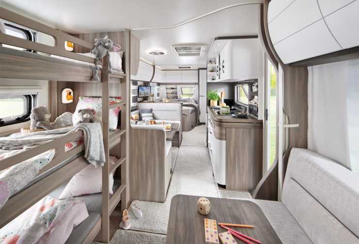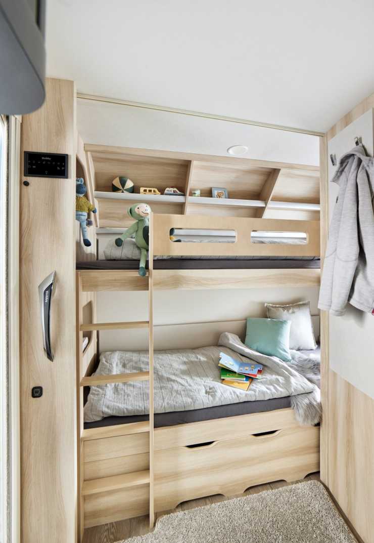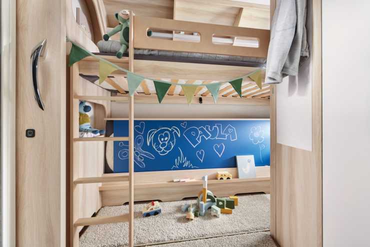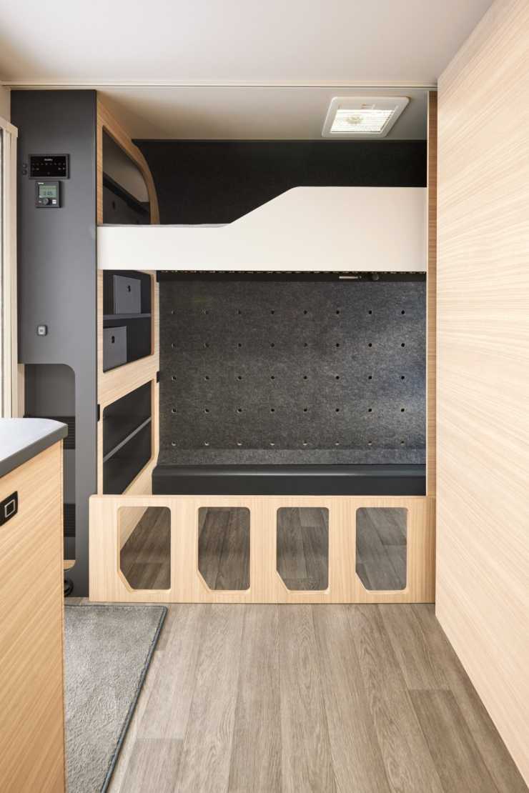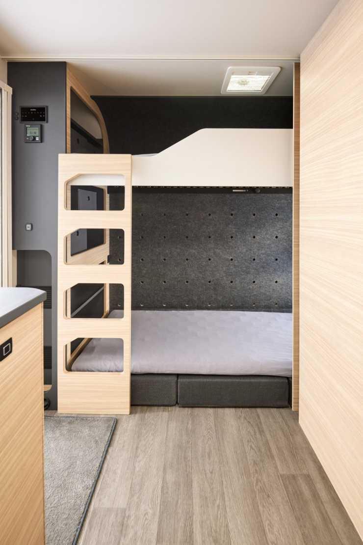 Finaste husvagnsserien Maxia får som vi tidigare rapporterat om en nya planlösning i form av mångsidiga familjevagnen 595 KMF. Den har en trevåningssäng som kan omvandlas till 0, 1, 2 och 3 våningar. Perfekt när barnen växer ur och man vill ha plats för en hund eller övrig last istället för att barnsängar ska ta upp utrymmet. Eller om man har färre barn kan det bli en rolig lekyta.