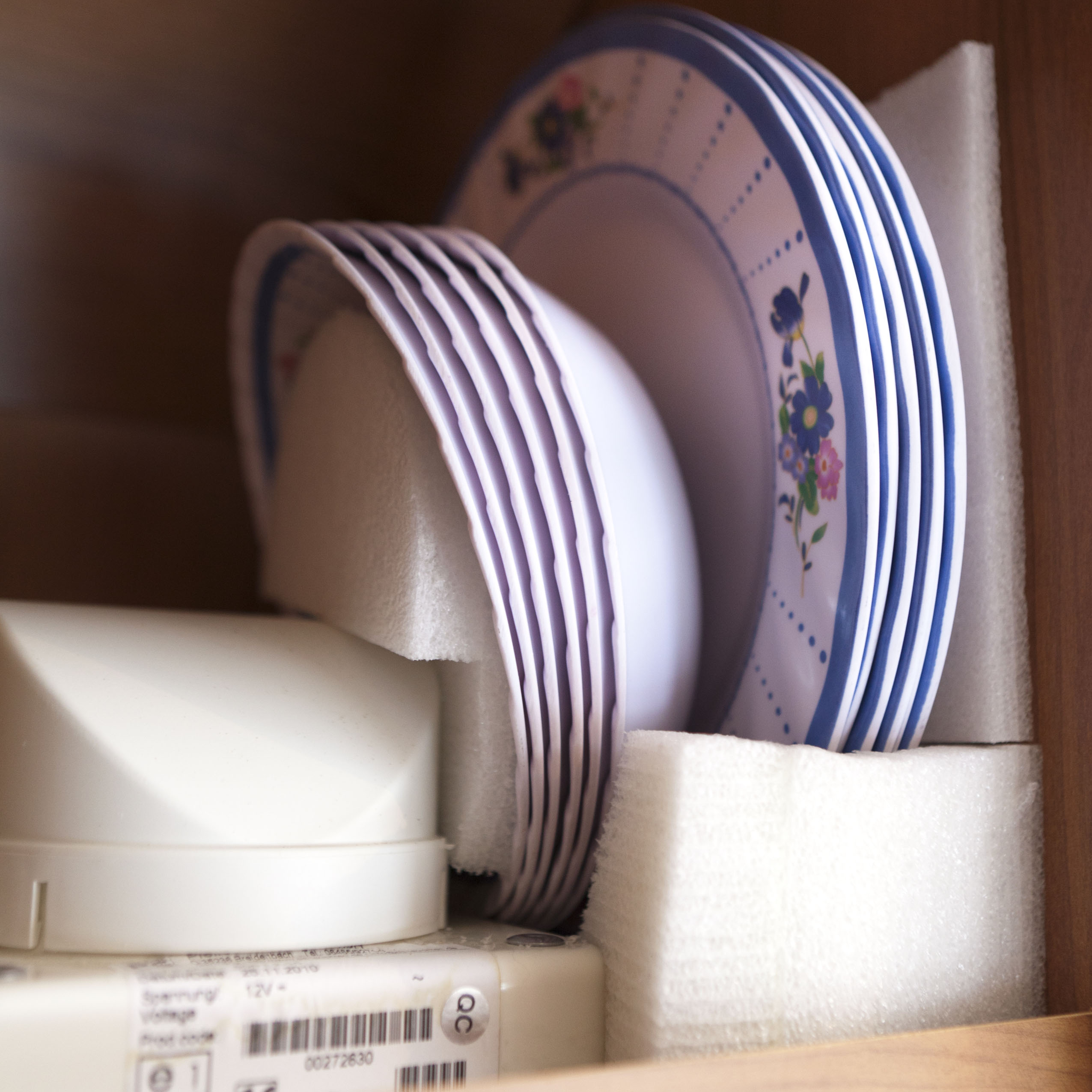 Stefan Kalmar har sågat ut måttanpassade hål i frigolit där porslinet vilar under resorna så att det inte bli kantstött.