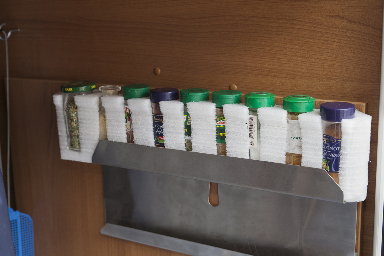 Den kombinerade kryddhyllan är hållare för uteköket. Utsågad polyeten plast håller kryddorna på plats. Under färd hänger den i garaget.