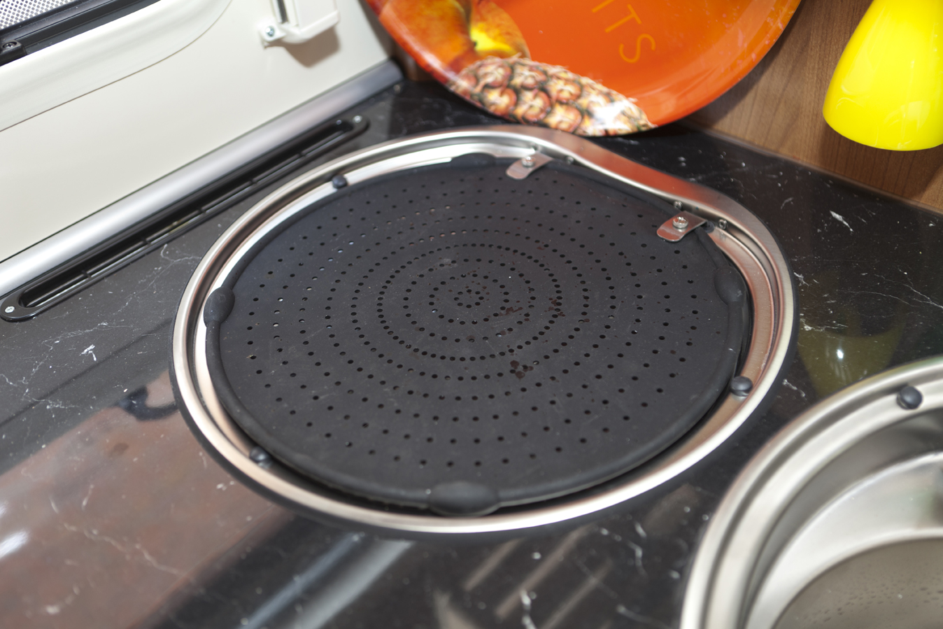 Över diskhon har Stefan tillverkat ett avrinningslock av gummi. Han klippte av hantaget på en stänkskydd av silikon och skruvade fast den på dropphons gångjärn.