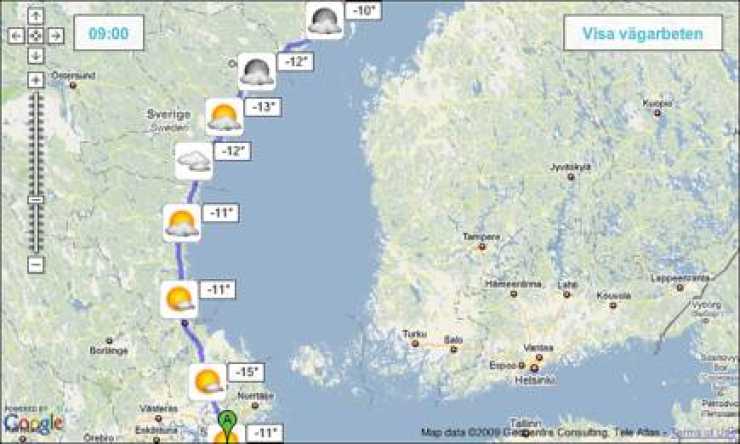 Hemsidan vackertvader.se har lanserat en ny smart tjänst där du först knappar in vilka orter du vill resa mellan. Därefter får du upp väder och temperatur på orterna längs resvägen. Dessutom finns ett knappval där alla vägarbeten och rastplatser längs vägen visas i form av ikoner på kartan.