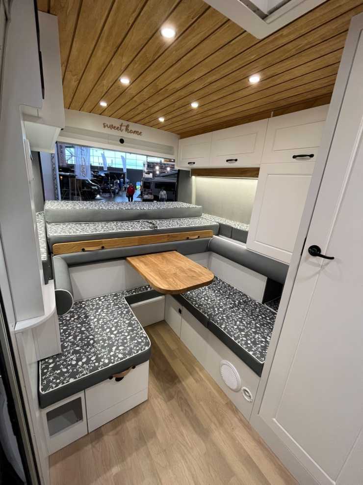 Inredningen är starkt influerad av hembyggartrenden vilket bekräftas snabbt av personal i montern. Bilen är byggd på korta Fiat Ducato på 5,4 m och får köras på vanligt B-körkort.