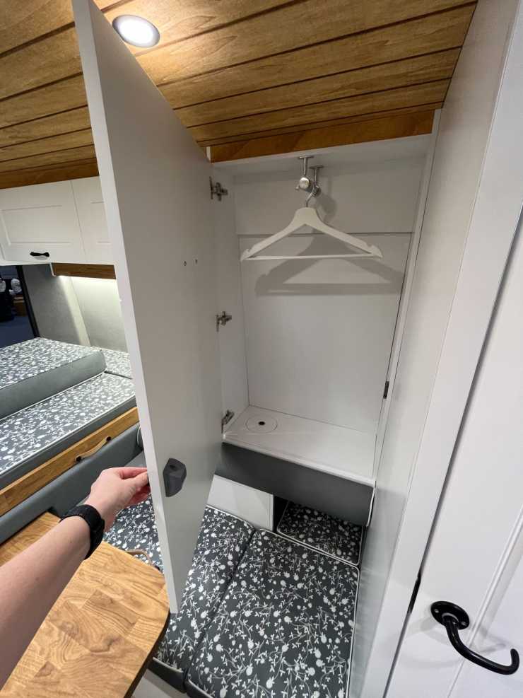 Vid behov går den lilla sängen att skjutas framåt så att ytterligare ett litet utrymme kan utnyttjas till fötterna. Då blir bädden istället 175 cm lång, dock vill det till att man inte rör sig för mycket eftersom bädden bara är 61 cm bred och inte har några kanter i detta framskjutna läge.