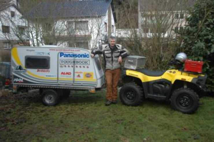 Jörg Schorr från Tyskland har tänkt korsa Afrika på en fyrhjuling med Dethleffs minsta husvagn MiniGlobe. Om resan lyckas så är det nytt världsrekord för denna typ av fordon.