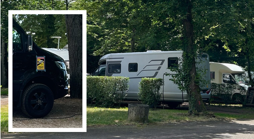 ””Angles Morts dekalerna, som är obligatoriska i Frankrike om du har en bil som väger över 3 500 kg, vållade oss oväntade problem under resan, ” skriver han.