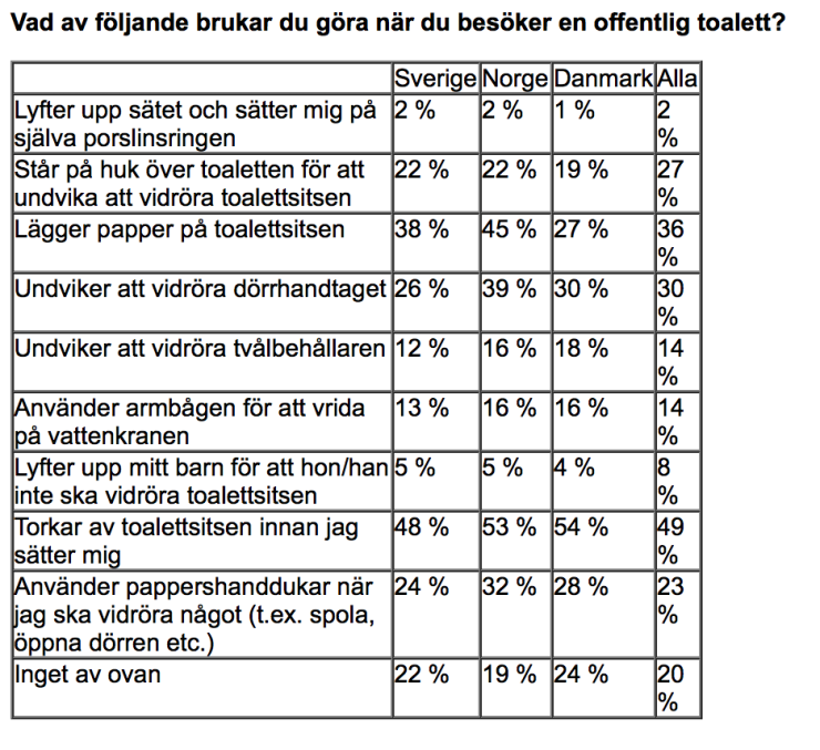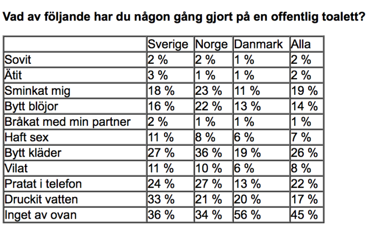 I undersökningen The Toilet Report har 3 500 personer från sju olika europeiska länder, bland annat Sverige, Norge och Danmark, svarat på frågor kring deras toalettvanor. Undersökning visar vad européerna faktiskt gör inne på toaletten och bland annat svarar hela 56 procent att de använder toaletten till fler saker än att bara uträtta sina behov. Dessutom uppger hela 86 procent av de som deltog i undersökningen att de alltid gör det viktigaste för en god hygien efter toalettbesöket, nämligen att tvätta händerna.