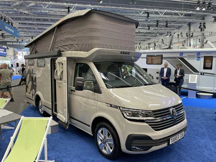 Knaus Tourer CUV har ett höjbart tak och byggs på VW:s lilla T-serie vilket gör den synnerligen smidig i trafiken och med taket upphöjt får liknande insida som vanliga husbilar.
