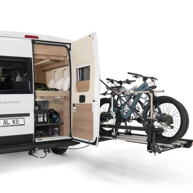 AL-KO Trigo-Van är en cykelhållare till plåtisar som klarar tre elcyklar och som fälls undan på ett smart sätt när man behöver komma åt plåtisens bakdörrar.