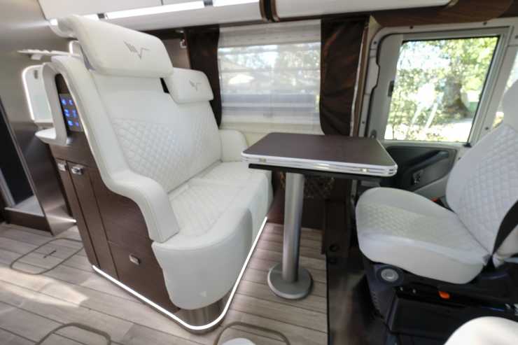 Mobilvetta K-Yacht 89 Tekno Line är en helintegrerad husbil tillverkad i samma fabrik som Mc Louis och Elnagh i Italien. Varumärket är fabrikens top-of-the-line vilket syns på materialval och teknik. Här är det vitt skinn i sittgruppen och vitblanka luckor i kök och överskåp. Golvet ser nästan ut som i en lyxyacht och matbordet är en smart utfällbar modell som blir dubbelt så stort i utfällt läge.