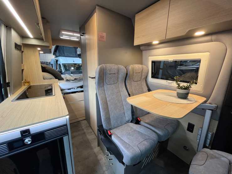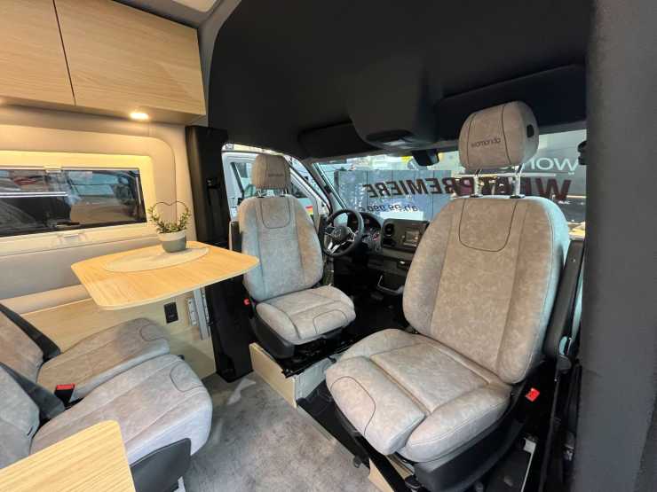 Womondo Pegasus byggs på MB Sprinter och i det här fallet det kortare skåpet och därmed tvärställd bädd. Den har för övrigt torrtoa och inte kassettoalett samt enkla och raka möbler utan krusiduller för att hålla nere prisnivån.