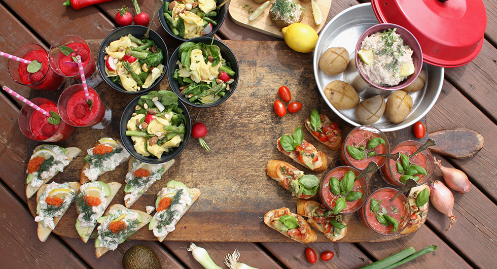 Bruschetta: Blanda avokado, tomater, lök, basilika och olja. Smaka av med salt och peppar. Gnugga bröden med färsk vitlök. Toppa sedan bröden med avokado och tomatsalsan.
