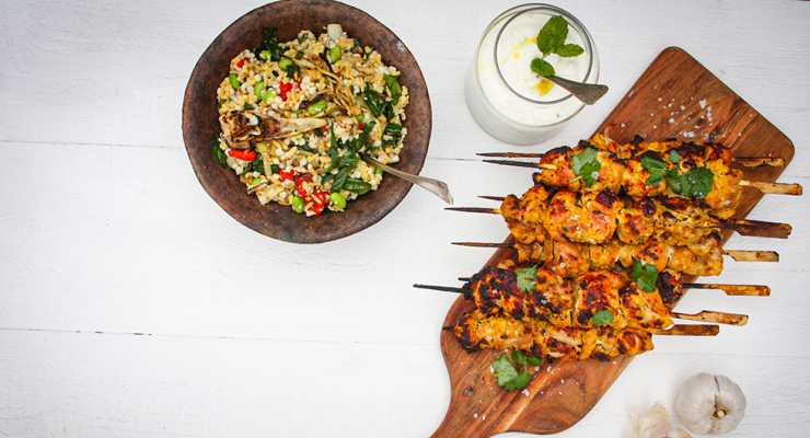 Låt spetten vila minst tio minuter och servera spetten med couscoussalladen och raita (garnera gärna med färsk koriander), spännande och mycket smakrikt!