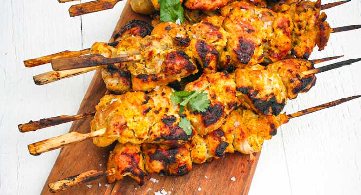 Trä upp på spett och grilla spetten runt om tills de är genomstekta (cirka 10– 15 minuter beroende på hur stora bitar du delat kycklingen i). Kycklingen kan fastna lite på gallret men släpper av sig själv när du vänder dem.
