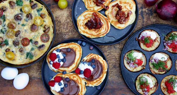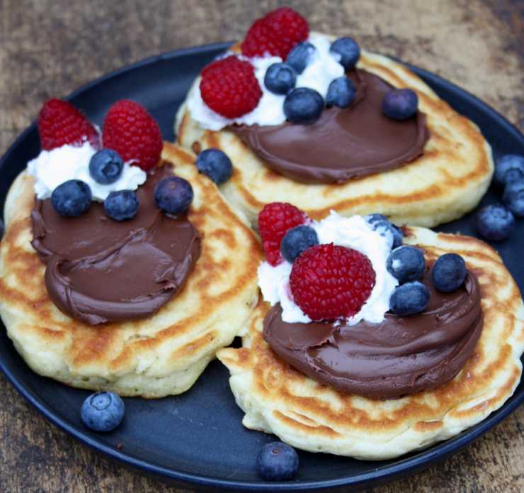 Servera med choklad eller hasselnötscrème, vispad grädde och bär. Perfekt även som lyxfrukost.