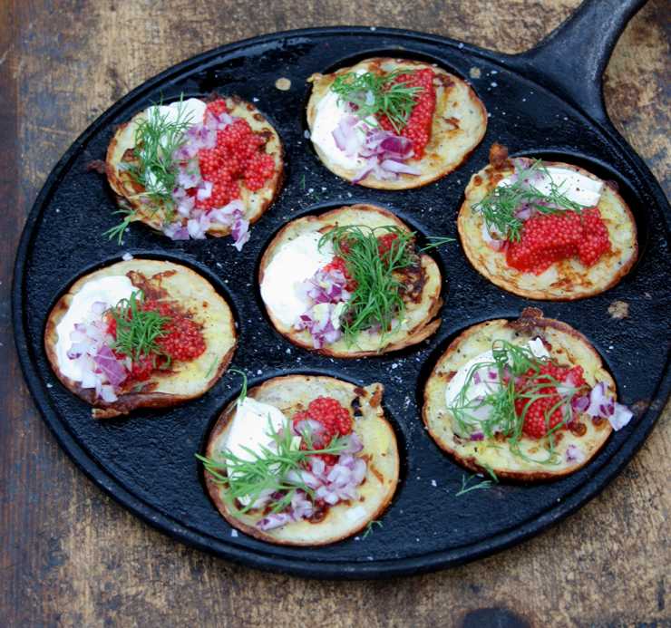 Stek i plättjärn (eller vanlig stekpanna) på medelvärme i lite smör. Garnera med crème fraiche, rom, lök och dill.