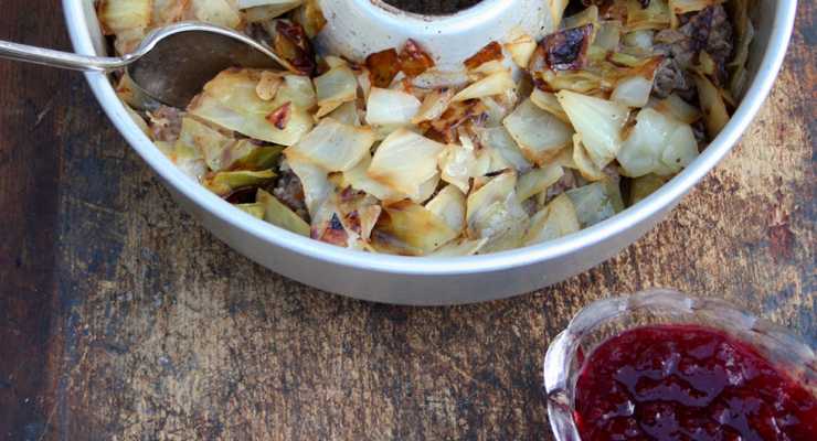 Blanda sedan färsen med lök, sirap, kalvfond, grädde och ägg. Smaka av med salt och peppar. Smöra formen och lägg kål i botten, sedan färs och sedan ett lager kål på toppen.