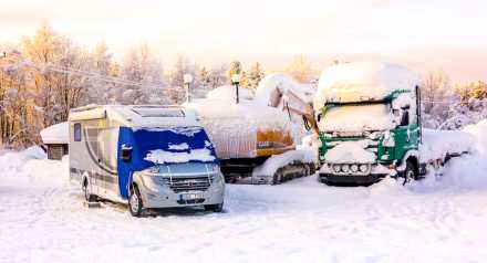 Glöm inte snöskyffel för att skotta ställplatsen, träplattor att ha under stödbenen, ficklampor och extra gasolflaskor.