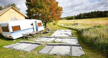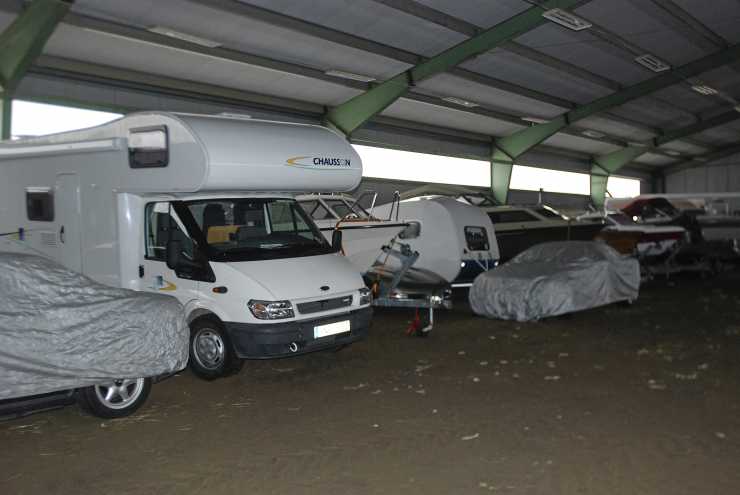 En carport eller ett förvaringstält fungerar utmärkt för husbilar och husvagnar. Är underlaget gräs eller grus kan det vara bra att skydda mot markfukt och isbildning genom att parkera på en presenning.