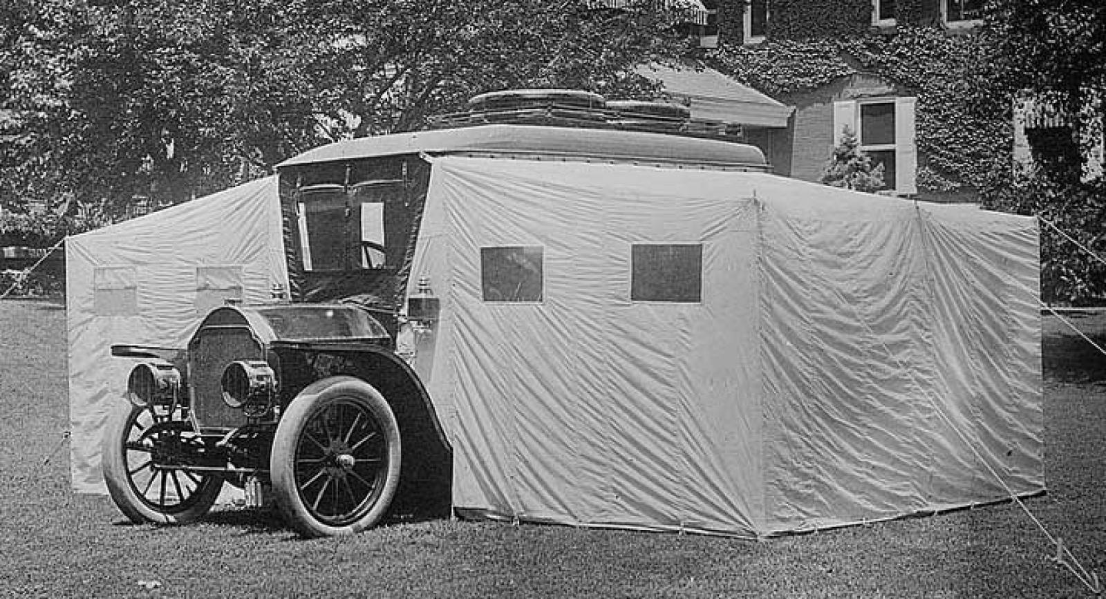 Men långt innan dess insåg man bilens möjligheter för att ta sig ut att campa i naturen. "Duponts camping Auto" är ett smart patent från runt 1910, bilen är mest troligt en Stoddard-Dayton.