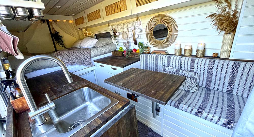 Erik Roos och hans fru Charlotte har byggt ett urtjusigt semesterboende på hjul med massor av avställningsytor, lyxig toalett, smarta lösningar och en bädd på två meter.