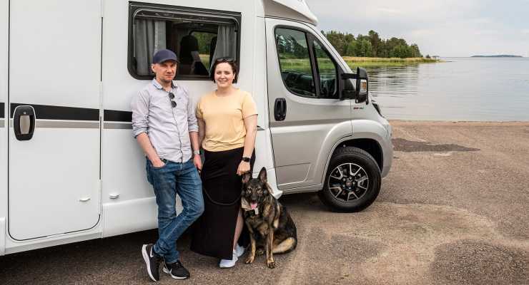 Pierre, Micaela och Alma utanför sitt hem och arbetsplats i form av en halvintegrerad Weinsberg Carasuit 650 MF.