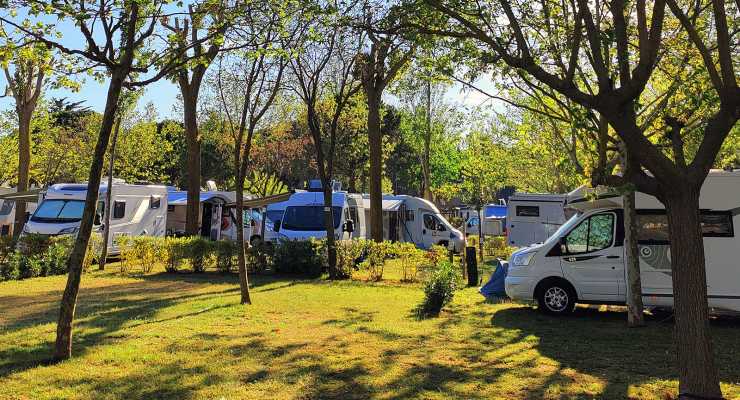Sju sorters lövträd skapar vackert ljus och bedårande fågelkvitter i Camping La Petite Motte.