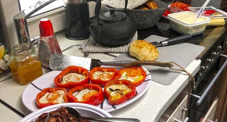 Att vara på resande fot sätter inte stopp för att göra trevliga måltider. För den som är van är en trerätters-meny inga problem att få ihop med lite planering. Hos familjen Lindblad utnyttjas allt; ugn, eldstad och spisplattor.