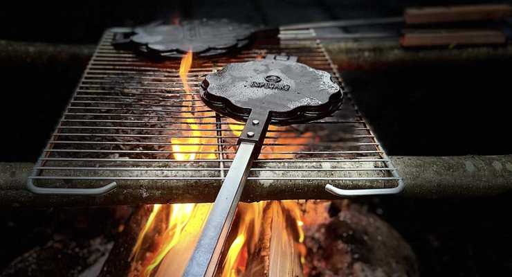 Familjen Lindblad gillar att lägga tid och vikt(!) på matlagning. Eftersom gjutjärn är tungt får det anses vara en ren och skär campinglyx att unna sig till exempel våfflor tillagade över öppen eld.