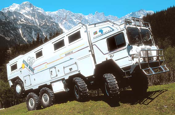 Den 4-axlade husbilen på bilden räknas till de största all-wheel drivna husbilarna i världen. Det finns 600 hk under huven, den är 3 meter bred, 4 meter hög, 12 meter lång och är monterad på ett MAN chassi Typ: KAT 1 A / 1 8x8, tidigare byggd som missilbärare (!).