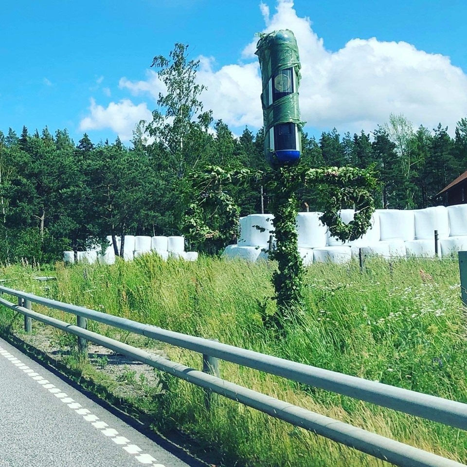 I julas hade den skägg, tomteluva och glitter, i påskas hade den lite ris, fjädrar plus kycklingar och nu i midsommartider är förstås en midsommarstång lämplig utstyrsel. Vad månde bliva när vi kommer till Halloween. Möjligen är detta humörhöjande tilltag som inte påverkar kamerans funktion något mer trafiksäkert eftersom kameran sitter betydligt närmare vägen än platsen där den först beskrivna dockan var uppställd. Men så är det ju en trafiksäkerhetskamera.