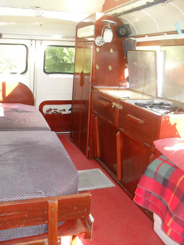 Husbilen har fortfarande alla sina ursprungliga inventarier men är fortfarande i utmärkt skick, skåpen är original och som den lämnade fabriken 51 år sedan. Husbilen har en liten diskbänk, en 2-lågig spis och grill och gasljus.