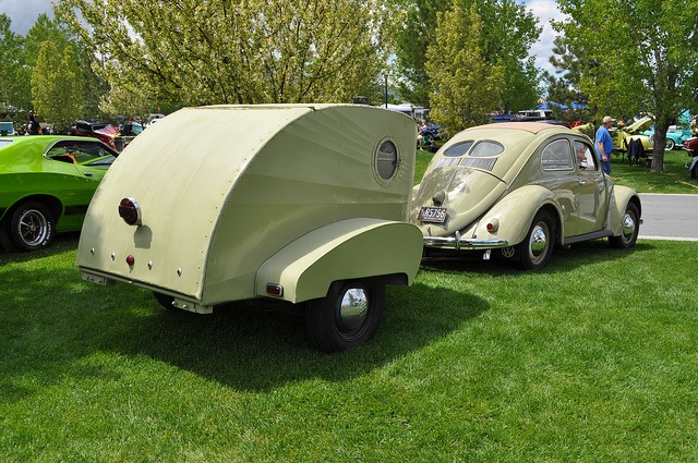 Idag får den klassiska folkan dra en vagn med lite färre fönster. Nog är det ett härligt ekipage vars dragbil tillverkats före 1953 då den delade bakrutan försvann.