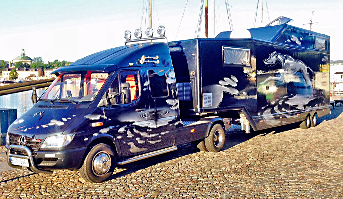 Det här läckert lackerade hundekipaget stötte vi på nu på morgonen på Strandvägen i Stockholm. Visst ger det idéer för dig som ska "pimpa" inför nästa säsong, i synnerhet om du både gillar husvagnar och hundar? Dessutom fungerar det nog med ett BE-kort.