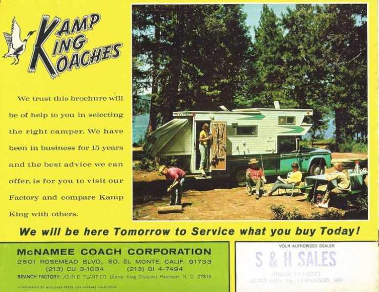 King Kamp Koaches hade ett antal innovativa campers i början av 1960-talet men någon direkt information om själva företaget är knepigare att hitta. De kom igång med verksamheten i slutet av 1940-talet och en av de mer spektakulära modellerna är denna med en terass.