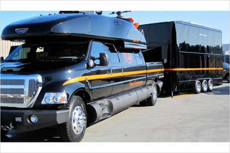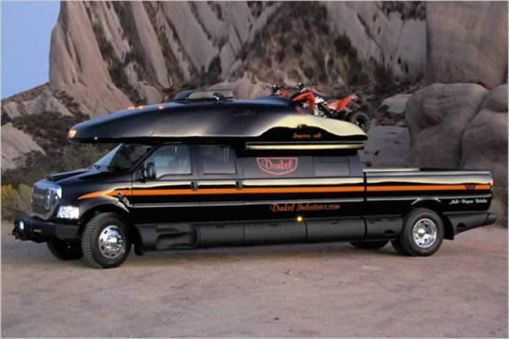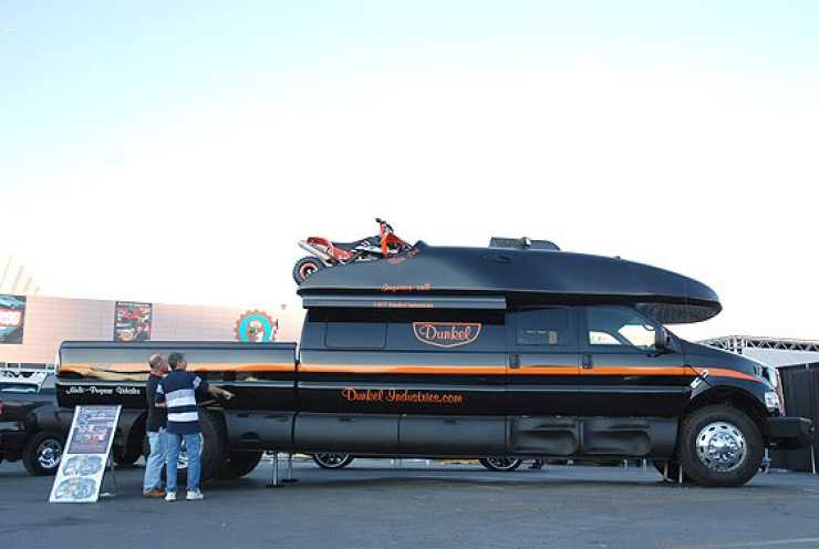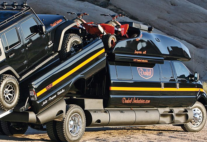 Dunkel Industries husbil visades på en mässa 2009 och trots att det skedde i USA väckte det enorm uppmärksamhet. Inte så konstigt eftersom husbilen byggdes på Ford F650 som är det största som finns i pick-up-väg. I bodelen väntar tio bältade platser, dubbla kylskåp, dubbla markiser samt givetvis dusch och toalett. Glasfiber, ceder- och körsbärsträ plus skinn hör till några av materialvalen invändigt, men köket är lite ynkligt med bara två kokplattor…