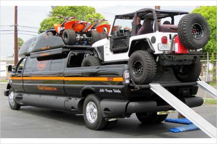 Taket kan höjas och sänkas längst bak för att underlätta lastningen av två fyrhjuliga motorcyklar eller en hel knippe tvåhjulingar förutom den rejäla Jeepen som ryms på flaket.