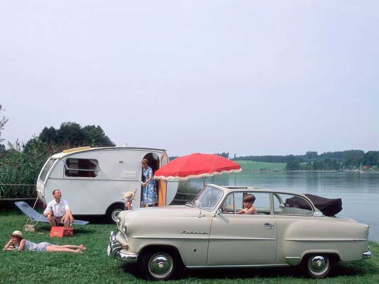 Sol, sommar, en sjö i bakgrunden och så förstås en husvagn. Och, inte minst, en drömbil många ville ha i slutet på femtiotalet i Opels värld. Visst ser det ut som familjen har en perfekt semesterdag?