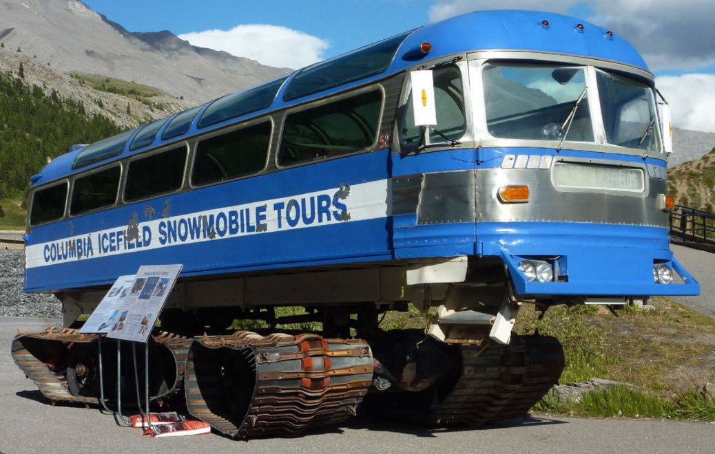 Snöbussen på bilderna är egentligen ingen husbil utan en helt vanlig turistbuss (nåja) för guidade turer i Kanadas Rocky Mountains. Men kanske är de ett bra grundämne för dig som vill bygga om och sedan blåsa runt på landets skoterspår och campa med off-pist-backarna utanför husbilsdörren.