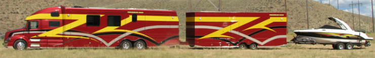 Vad sägs om en rejäl bodel med slide-outs, en garagetrailer för en stor bil, 2 st vattenskotrar och 2 st fyrhjuliga motorcyklar och sist i "tåget" kommer så ett släp med en rejäl motorbåt på 30 fot.