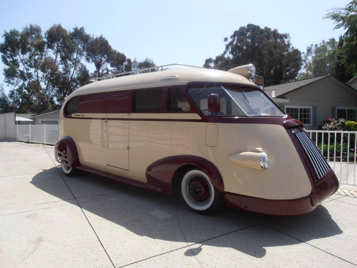 1941 Ford Western Flyer, One of three built in 1941, by Brook Stevens. Modified by Howdy Ledbetter. Complete motor-home interior, refridgerator, 2 burner stove, diamond-back whitewall tires especially made, 4,000 watt Cummings generator. New chassis, 460 Ford computered, automatic overdrive transmission, setup with a tow package. All new construction, interior and paint by Howdy. First time out award winner at GoodGuys.