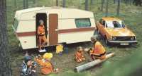 Det råder knappast någon tvekan om att modefärgen var orange när denna totalarrangerade reklambild togs. Utöver Polarvagnen och bilen ser vi en Honda Z50J Monkeybike, en sådan som kastades i vattnet i filmen Göta Kanal. Och så förstås en hel familj i matchande overaller. Hinken och de blå tofflorna passar dock inte in, hur kunde de missa det?