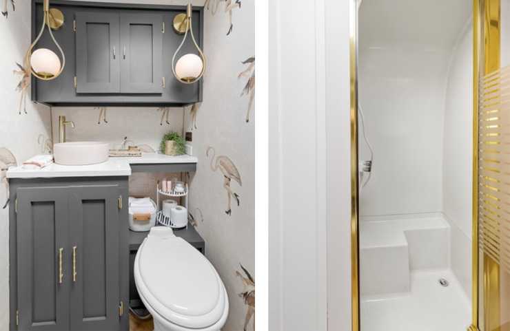 Söt lampor, litet handfat och gott om förvaring på toaletten – som har flamingos på väggarna.